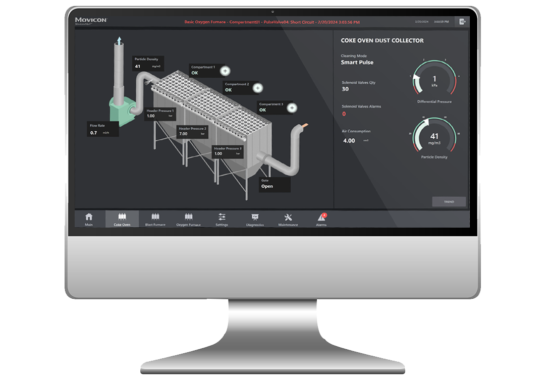 Movicon.NExt SCADA HMIAt the heart of this solution are the software and interface capabilities that enable operators to make informed, real-time decisions and streamline dust collector performance. A central element of the solution is the Movicon.NExT SCADA platform, offering intuitive HMIs, remote monitoring, alerts, and data visualisation. Together with the PACSystems™ PLCs, RSTi-EP I/O modules and QuickPanel+ HMI, the system enables efficient control of multiple filter lines, real-time diagnostics, and predictive maintenance. Its scalable architecture can support systems of up to 500 pulse valves.