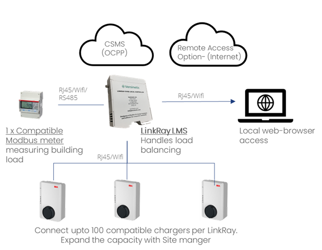 - Real time Monitoring: Monitors energy use on-site using a meter with Modbus TCP IP/RS485. Automatically adjusts the EV charger limits so that the load is balanced to the site.